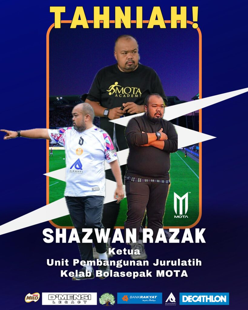 Kredibiliti, pengalaman dan keupayaan yang ada pada beliau amatlah ditagih untuk sama-sama membantu kelab dalam membangunkan kelab ini. Selamat Maju Jaya buat Jurulatih Shazwan Razak! KELAB BOLASEPAK MOTA MOTA ACADEMY